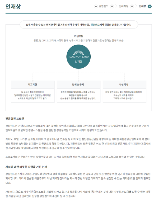 - ‘서비스 품질 향상’, ‘고객 만족도 제고’, ‘성장’과 같은 내용은 좋은 목표지만, 매우 추상적이고 일반적인 포부였습니다. 강원랜드라는 기업의 특성을 고려한 구체적인 계획이나 기여 방안이 부족했습니다.