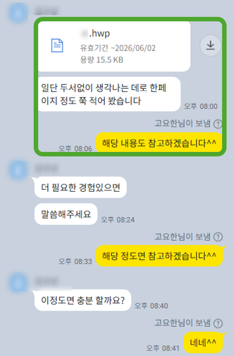 공유해주신 이력서와 자기소개서를 토대로, 지원자분의 강점과 약점을 파악하고 나노융합기술원 인재상에 부합하는 방향으로 수정하는 작업을 진행했습니다. 특히 ‘경험’을 ‘역량’으로, ‘사실’을 ‘스토리’로 재탄생시키는 데 집중했죠.