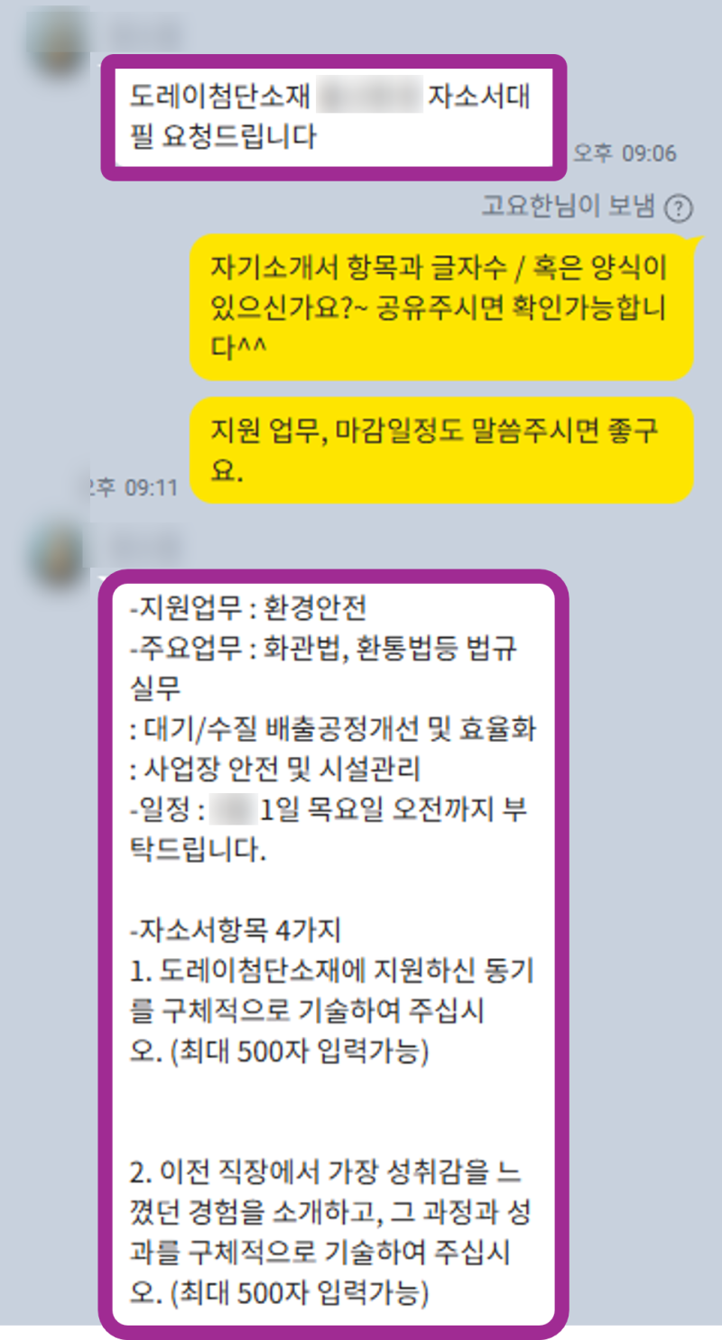 OOO님은 이전 직장에서 여러 프로젝트에 참여하며 문제 해결 능력을 키워왔지만, 이를 단순히 ‘업무 수행 경험’으로만 나열하고 있었습니다. 저는 OOO님의 경험을 도레이첨단소재가 추구하는 ‘혁신’, ‘기술 개발’, ‘안정적인 생산’과 같은 가치와 연결하는 작업을 집중적으로 진행했습니다. 솔직히 말씀드리면, 처음에는 글자 수도 안 맞고 내용도 엉성해서 거의 대필 수준으로 내용을 재구성했다고 보시면 됩니다. 하지만 OOO님께서도 적극적으로 자신의 경험을 이야기해주시고, 제가 제시하는 방향에 귀 기울여주신 덕분에 만족스러운 결과물을 만들 수 있었습니다!