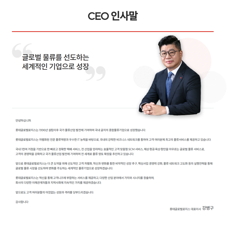 - • 핵심가치: 롯데그룹의 핵심가치인 고객중심, 창의도전, 협력상생, 책임감을 기반으로 물류 혁신을 이끌어갑니다.