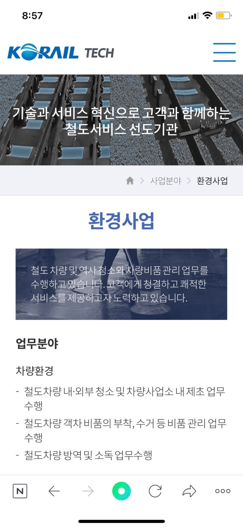 - ✨ 주요 사업: 철도차량 유지보수, 철도 시설물 유지보수, 환경 관리(역사, 시설물 청소, 폐기물 처리 등), 경비, 시설관리 등