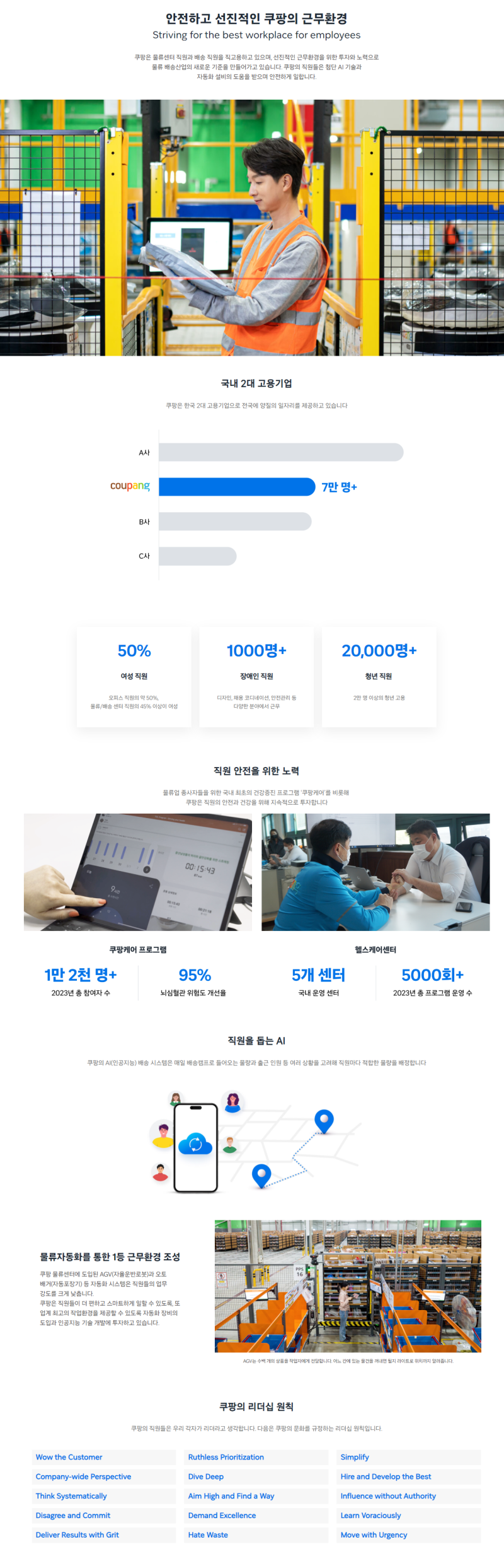 - 핵심가치 및 비전: ‘고객은 와우한다(Customer is Wow)’를 최우선으로, 고객에게 감동을 주는 경험을 제공하는 것에 집중해요. 기술 기반의 혁신을 통해 물류 및 배송 경험을 끊임없이 발전시키고 있습니다.