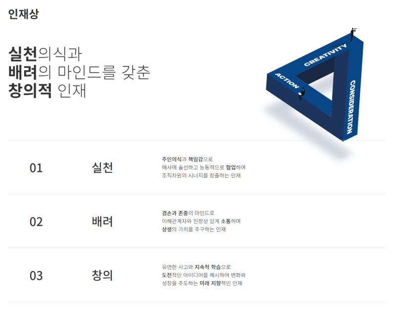 인재상: 끊임없이 배우고 도전하는 인재, 창의적인 아이디어로 혁신을 이끄는 인재, 동료와 협력하여 시너지를 창출하는 인재, 안전을 최우선으로 생각하는 인재