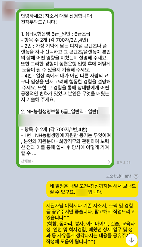 [농협은행/농협생명보험] 채용 자소서 작성법, 자기소개서 첨삭 대필 후기