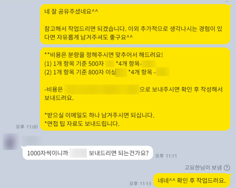 • >> 결제 및 자료 전달: 필요 서류 (이력서, 채용공고 등) 전달