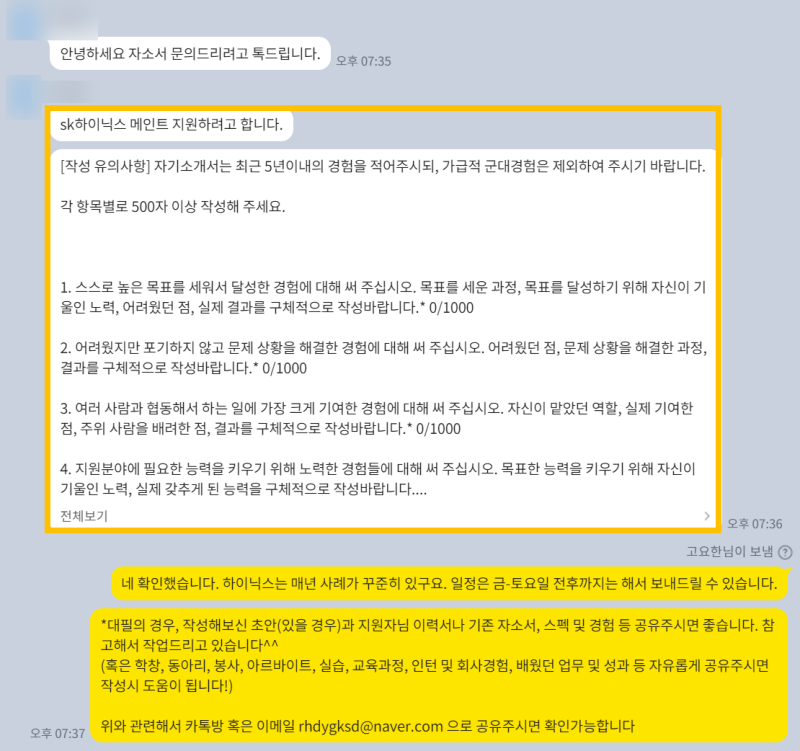이번 SK하이닉스 채용의 자기소개서 문항들은 다음과 같았어요. 각 문항에서 요구하는 바를 정확히 파악하고, 저의 자기소개서 전문가로서의 경험을 살려 답변 방향을 잡아드렸습니다.