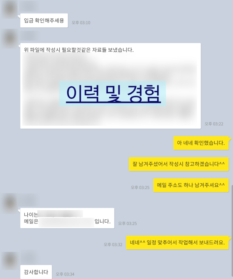 기존 이력서, 자기소개서 초안, 관련 경험 등 필요한 자료를 저에게 공유해 주세요. 결제가 완료되면 작업이 시작됩니다. 📁